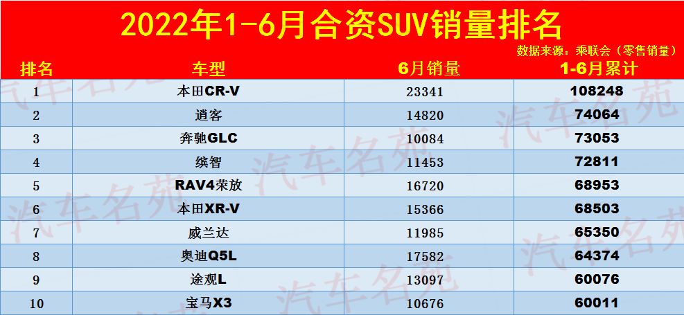 时间:2022-07-19导读:根据乘联会最新消息获悉,2022年1-6月份合资SUV销量排行榜公布,1-136名!数据显示,合资SUV的表现比较惨淡,只有本田CR-V突破了10万辆大关,其它车型均不足8万辆!日产逍客、奔驰GLC、本田缤智和丰田RAV4荣放入榜前五,本田XR-V、丰田威兰达、奥迪Q5L、途观L和宝马X3分列六至十名,但它们的累计销量都不足7万辆。本田皓影和大众途岳都只有5万多辆,大众探岳、丰田汉兰达、别克昂科威、捷达VS5、现代ix35、凯迪拉克XT5和林肯冒险家等车型,1-6月份的市场表现均很一般。官宣!1-6月合资SUV销量排名:1-136名,仅本田CR-V突破了10万!