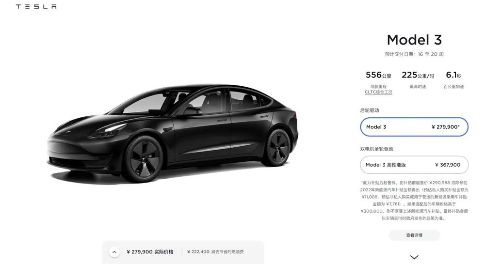 经过多次的价格调整之后,特斯拉中国在售的车型中就只有后驱版Model 3仍然可以享受到政策补贴。事实上,这已经是特斯拉在5天内进行的第二次涨价了,在3月10日Model 3性能版、Model Y长续航版以及Model Y高性能版就上调了1万元。