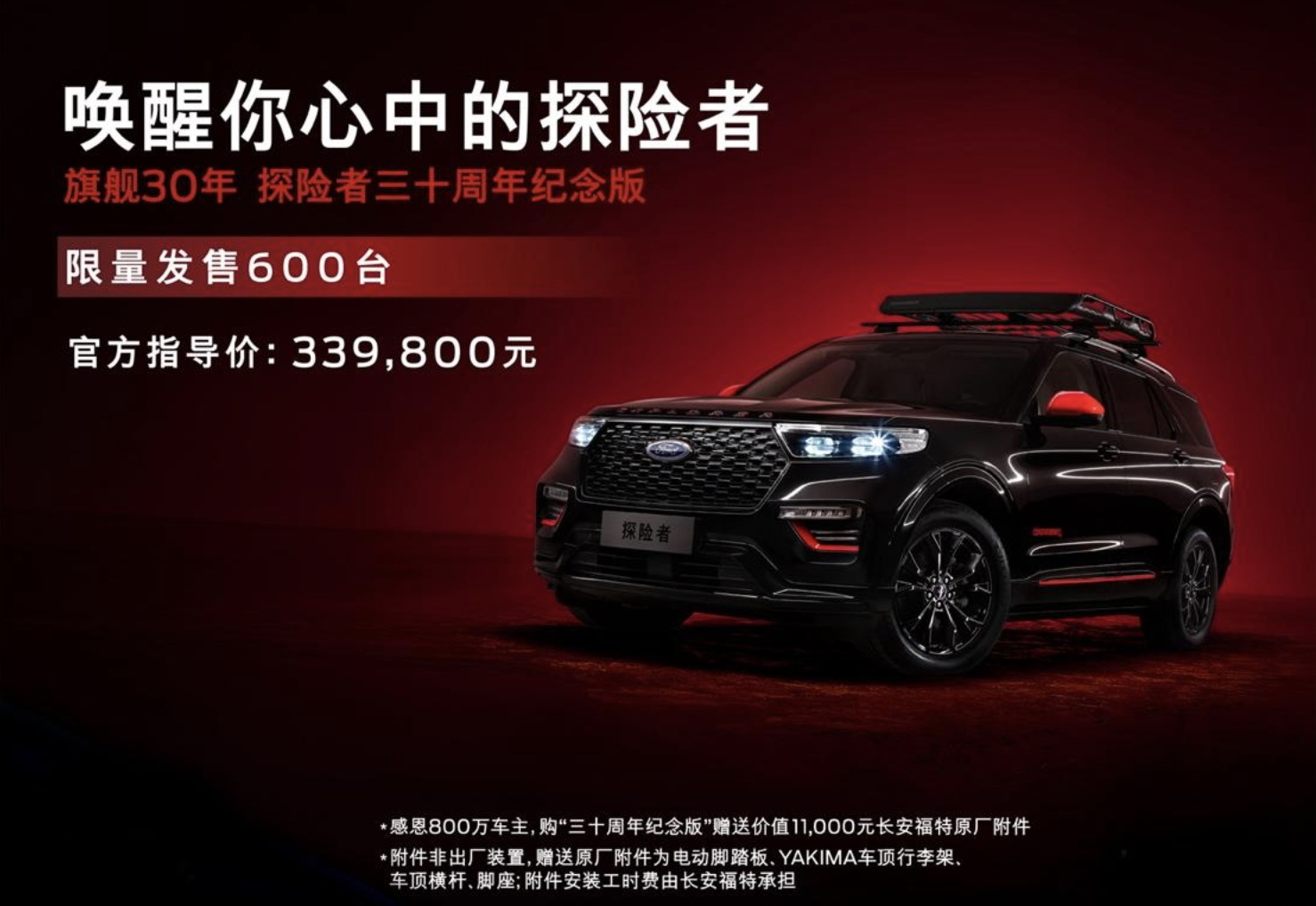 日前,小编从长安福特官方获悉,旗下探险者三十周年纪念版车型正式上市,指导售价33.98万元,并将以限量600台的形式发售。据悉,新车还将赠送价值11000元的原厂附件,以感恩回馈全球800万用户的支持,原厂附件包含:荣耀金阶电动踏板可智能自动伸缩以及车顶行李架。