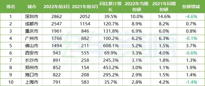 2021年前三月,销量破1000辆的城市仅有2座,为深圳、成都。而2022年前3月,有5座城市的销量超1000辆,分别是深圳(2862辆)、成都(2547辆)、重庆(1961辆)、广州(1766辆)、佛山(1494辆)。深圳和成都依然以超2000辆的“亮眼成绩”分别位居榜单第一、第二,其市占比分别是10.0%、8.9%。