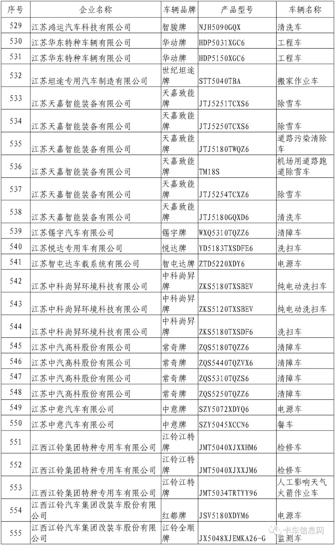 本公告将工业和信息化部装备中心在审查过程中发现的、完全满足20号公告附件1《技术要求》的、并建议列入《清单》的绿化喷洒车、洒水车、洗扫车3种专用车辆列入《清单》。