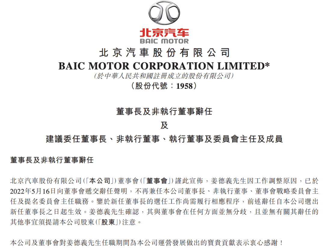时间:2022-05-205月18日,北京汽车股份有限公司(下称“北汽股份”)发布公告,姜德义因工作调整原因,已于2022年5月16日向董事会递交辞任声明,不再兼任公司董事长、非执行董事、董事会战略委员会主任及提名委员会主任职务。同时,董事会建议委任陈巍为公司董事长、董事会战略委员会主任及提名委员会主任,任期自股东于股东大会批准陈巍任公司非执行董事之日起、至第四届董事会任期结束时止。不过,很快这一新闻却被传为北汽集团董事长换帅,迅速在网络上刷屏。