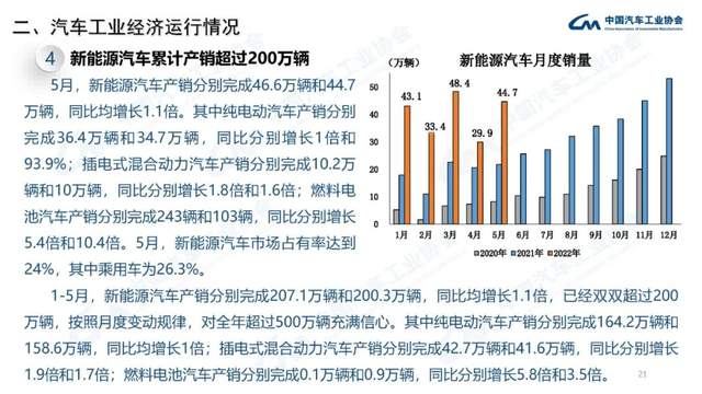 5月,新能源汽车产销表现也较为出色,当月产销分别达到46.6万辆和44.7万辆,环比增长49.5%和49.6%,同比增长均为1.1倍,市场占有率达到24.0%。在新能源汽车主要品种中,与上月相比,纯电动汽车、插电式混合动力汽车、燃料电池汽车产销均呈增长,其中纯电动汽车增速更为明显;与上年同期相比,上述三大类品种产销均呈高速增长,燃料电池汽车增速依旧最为显著。