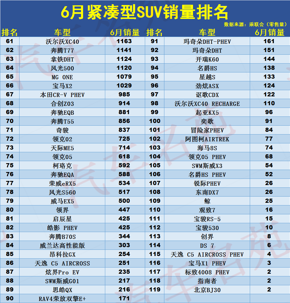 大众途岳、丰田锋兰达、奥迪Q3、哈弗大狗和长安欧尚X5也都入榜前二十,途岳和欧尚X5的表现比较惨淡。新车型卡罗拉锐放表现出色,6月份大卖7千多辆,捷达VS5、传祺GS4、长安UNI-T、现代ix35、荣威RX5以及五菱星辰等知名紧凑型SUV,上半年也都有过月销破万,但6月份销量都只有几千辆。奇瑞瑞虎7、林肯冒险家、宝马X1、凯迪拉克XT4、现代途胜以及奔驰GLA等车型,更是跌破了5千辆大关。最后,对于6月紧凑型SUV销量排名1-119名,比亚迪宋PLUS夺冠,逍客仅第七,大家都怎么看呢?
