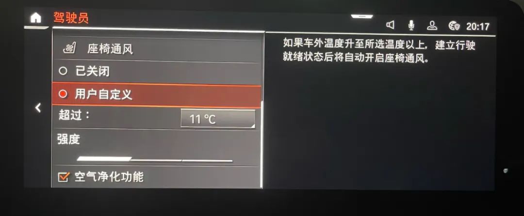 5. 也可以对座椅通风/座椅加热功能进行设置强度。