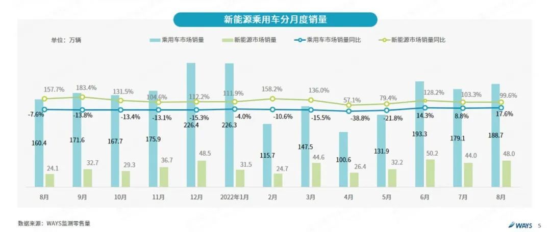 8月,新能源市场销量约为48.0万辆,同比上涨99.6%,同比增速远超乘用车。