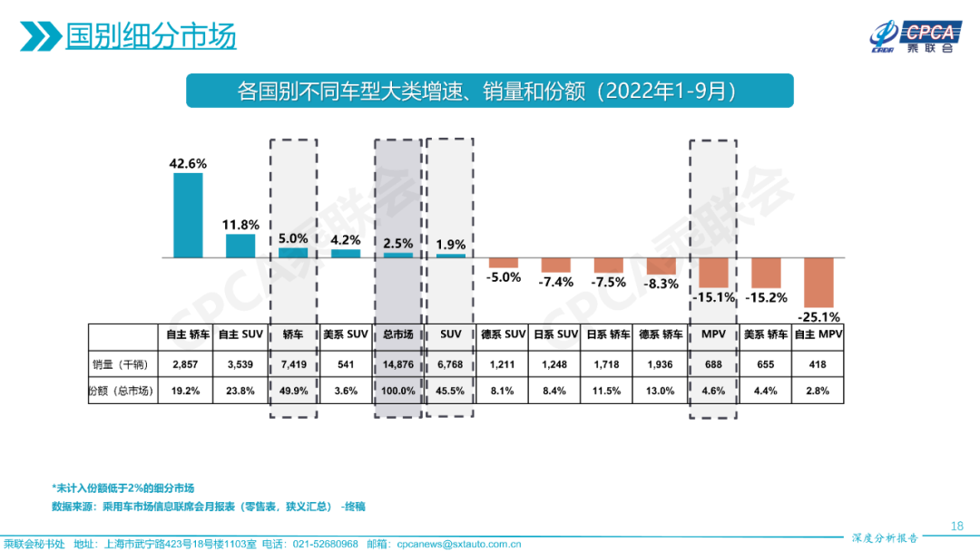 各国别不同车型大类增速、销量和份额——2022年9月及累计