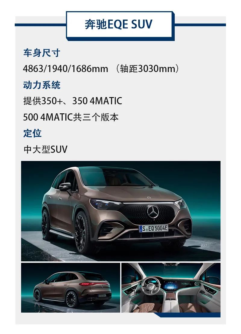 新车尾部采用了贯穿式尾灯设计、并且保险杠上还有粗壮的排气装饰。相比此前的豪越车型,豪越L的尺寸进一步加大。新车长宽高分别为4860/1910/1770(1840)mm,轴距2825mm,相比现款豪越车长增加25mm,轴距增加10mm,有利于车内空间的塑造。大咖点评:对于追求的大空间又囊中羞涩的消费者来说,十万出头的豪越原本就是一个不错的选择。如果豪越L能够加量不加价,或许能够以错位竞争的优势,形成对同价位紧凑型SUV的压制。在2022巴黎车展前夕,全新奔驰EQE SUV进行了首发亮相,它定位为纯电动中大型SUV,是EVA平台的新产品。新车采用了我们熟悉的奔驰EQ家族式设计,有着奔驰品牌出色的豪华感和科技感,同时发布的还有它的AMG版本。值得一提的是,该车很快就将在北京奔驰国产。