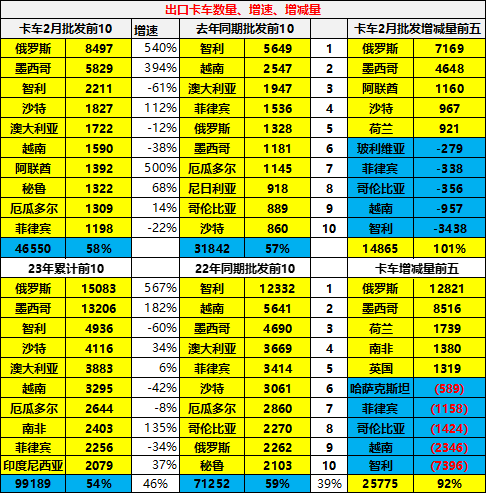 2023年1-2月份增量相对较多的是俄罗斯和欧洲和北美、亚洲的市场,俄罗斯、墨西哥、比利时、沙特、菲律宾等都很强。