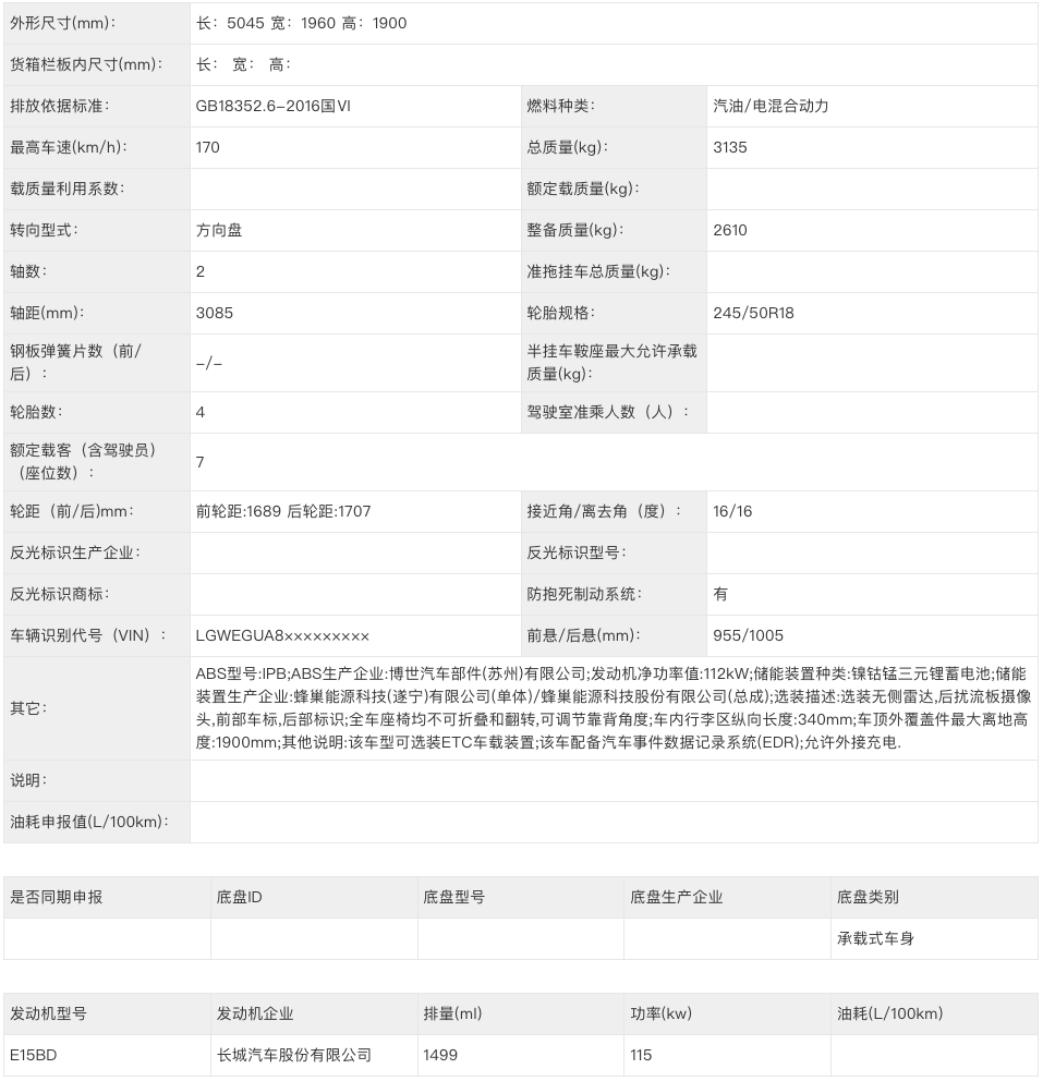 动力方面,新车将搭载由长城汽车股份有限公司所生产的型号为E15BD的1.5T发动机组成的插混系统,最大功率115千瓦,配备蜂巢能源提供的三元锂电池。