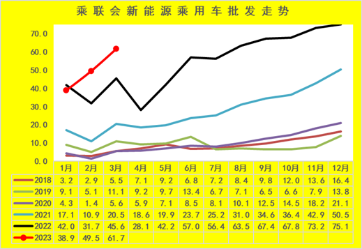 3月新能源乘用车批发销量达到61.7万辆,同比增长35%,环比增长25%,相对于历年的3月新能源低于2月的惯例,今年的2月新能源较低,带来3月的强势回升。