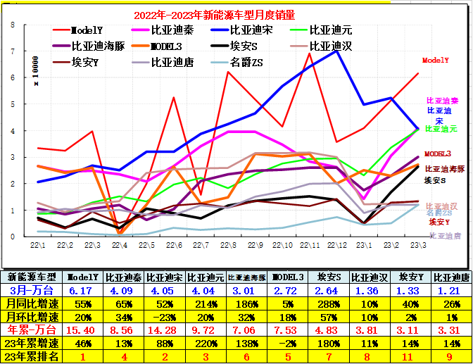 3月纯电动车型表现相对较强的是特斯拉MODEL Y、比亚迪元、海豚、MODEL3、埃安等产品。
