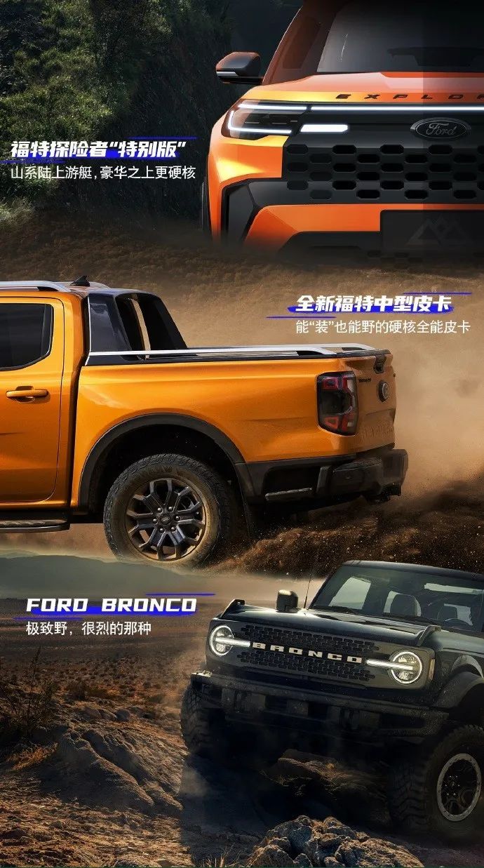 此次上海车展,福特将会带来福特探险者“特别版”、全新福特中型皮卡、FORO BRONCO三款车型。