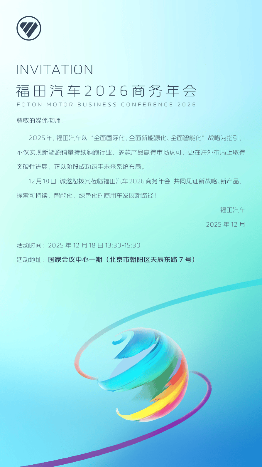 以2026商务年会为新起点,福田汽车将持续以创新进取的精神内核,加速“三个全面”战略转型,进一步提升核心竞争力,向世界一流商用车企业目标稳步迈进。12月18日,数千名权威媒体、合作伙伴、战略客户和经销商代表将在北京国家会议中心共同见证这场行业盛事,福田汽车官方视频号、抖音号也将全程直播盛况。让我们共同期待,福田汽车在新的发展阶段,持续领跑商用车行业,书写世界一流商用车企业的崭新篇章!
